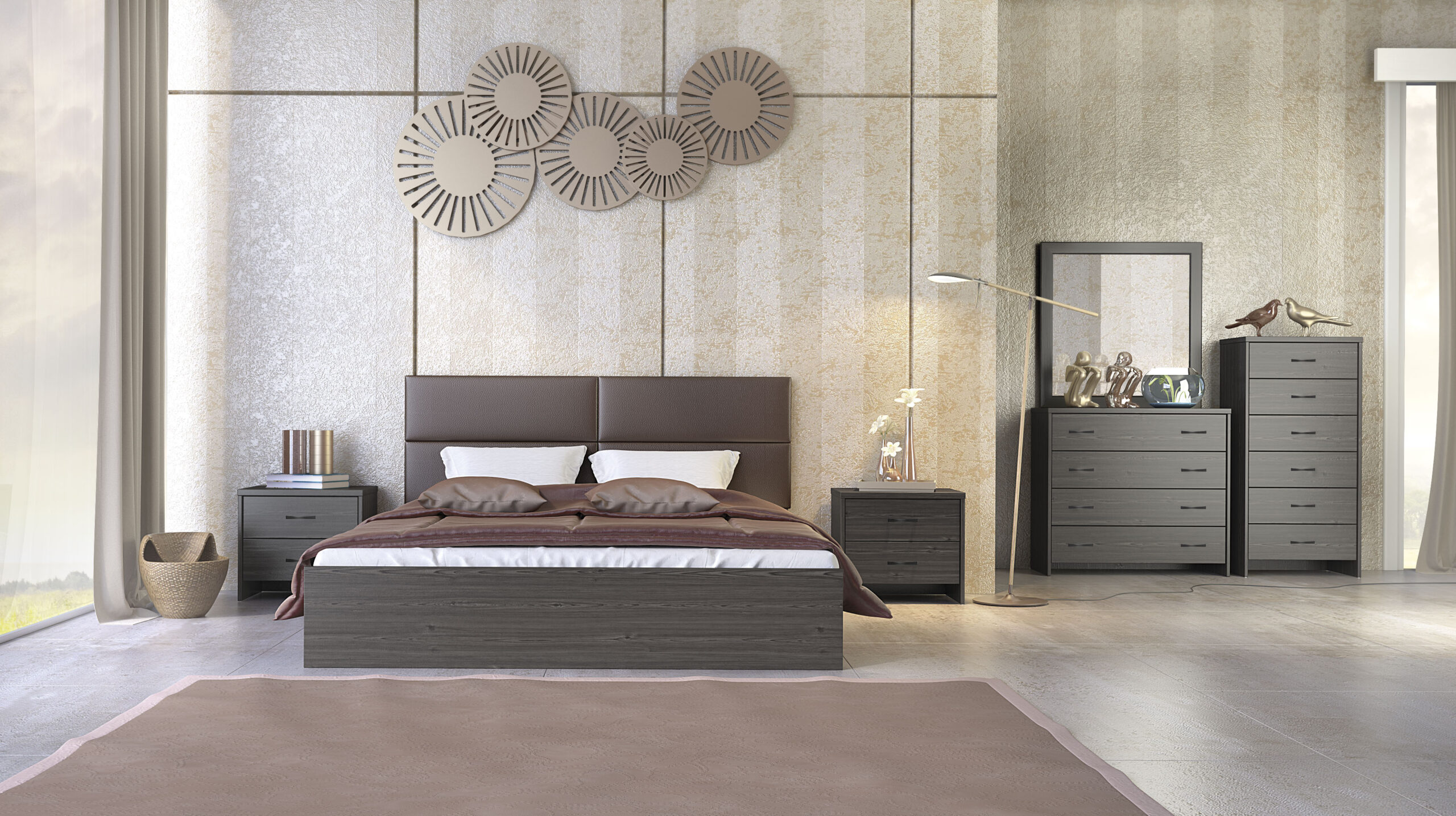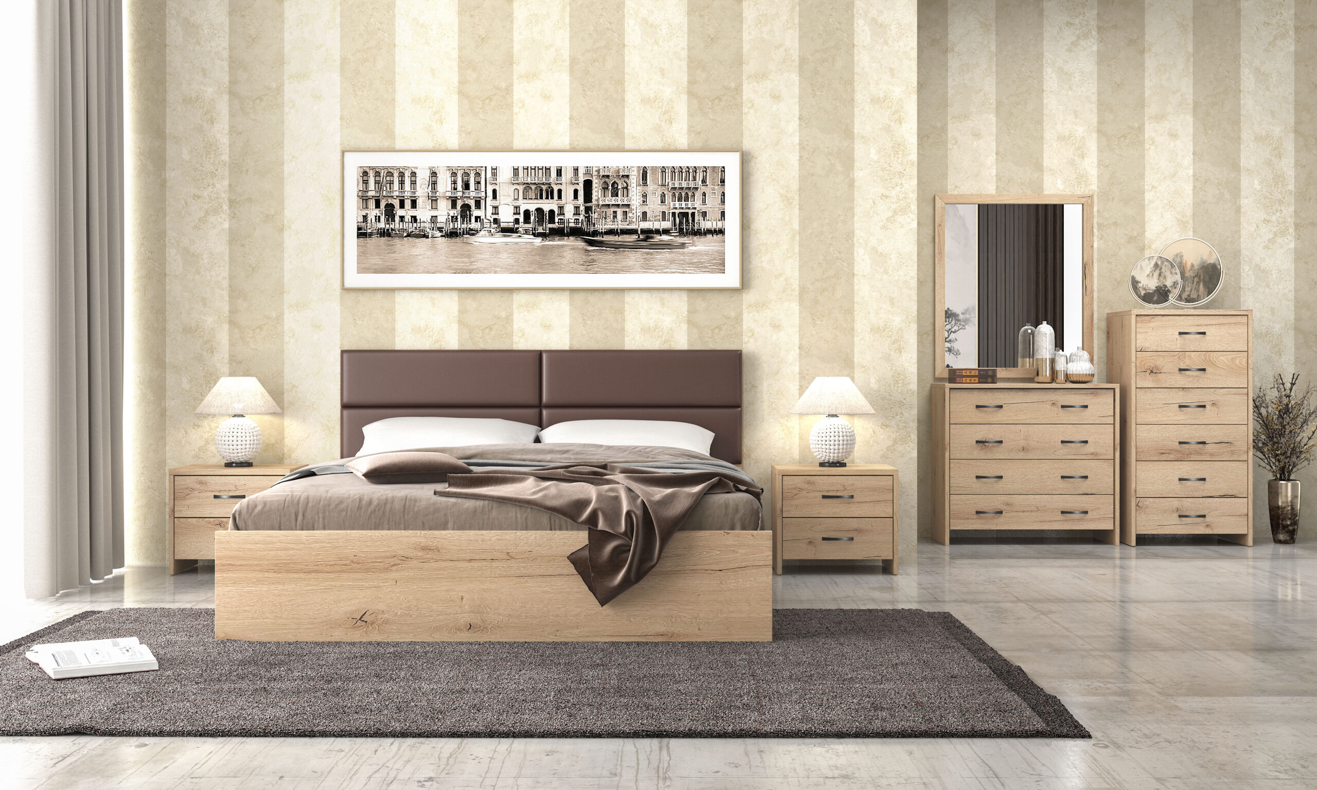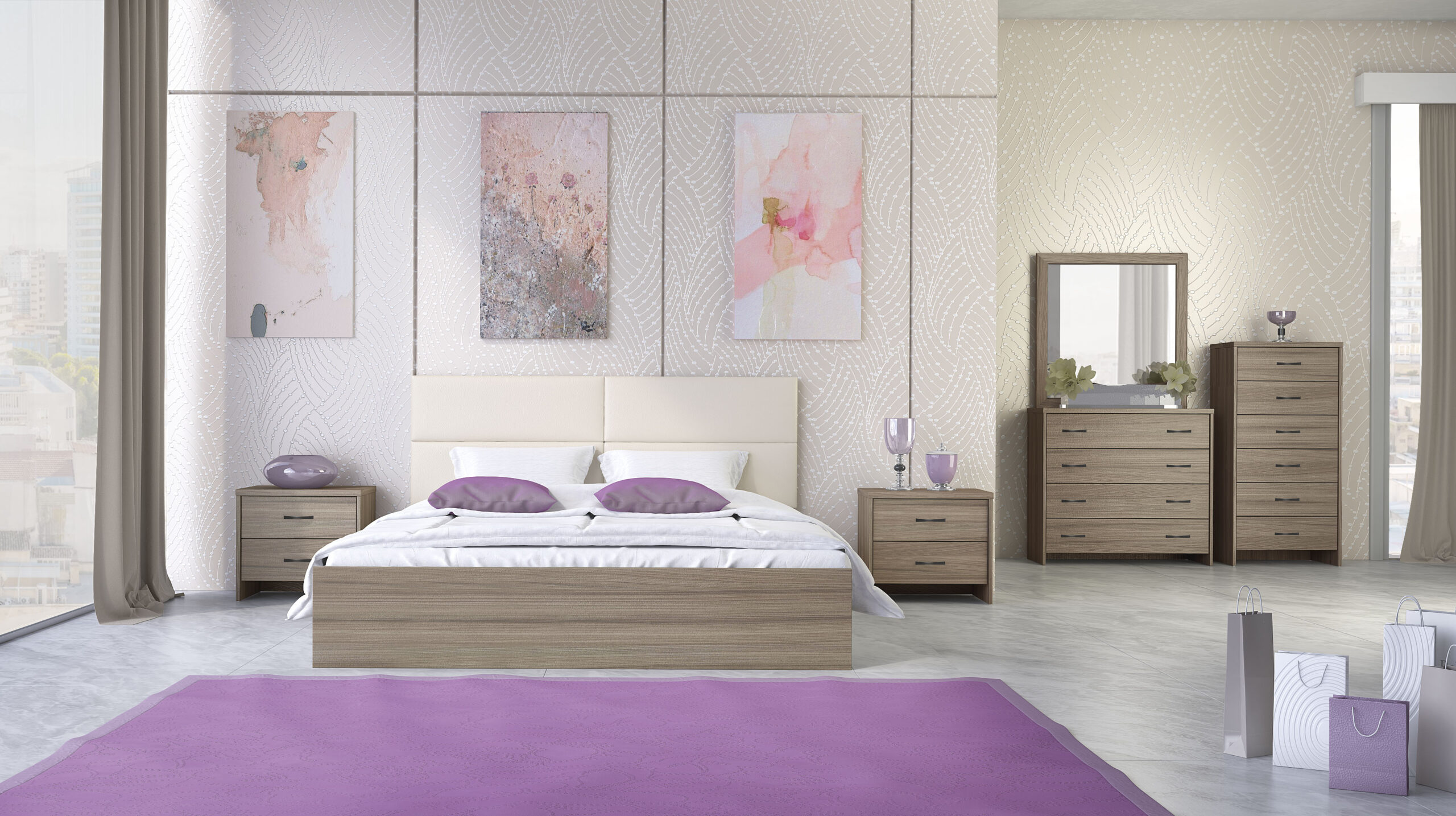 Σετ κρεβατοκάμαρα αποτελούμενη απο κρεβάτι με δερμάτινο κεφαλάρι, 2 κομοδίνα με 2 συρτάρια,τουαλέτα και καθρέφτη.