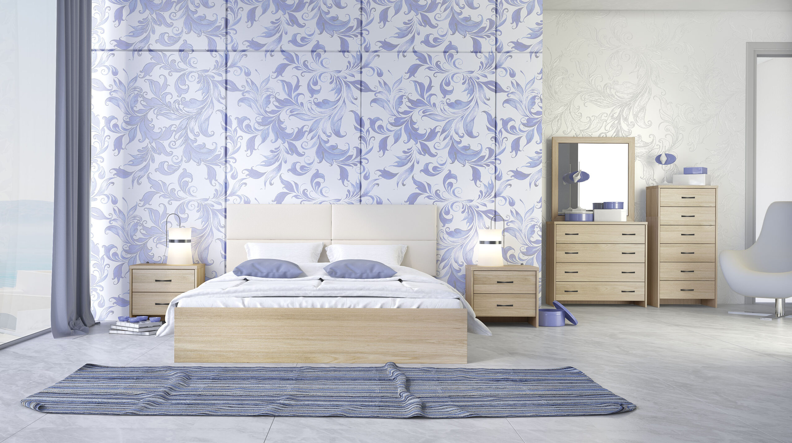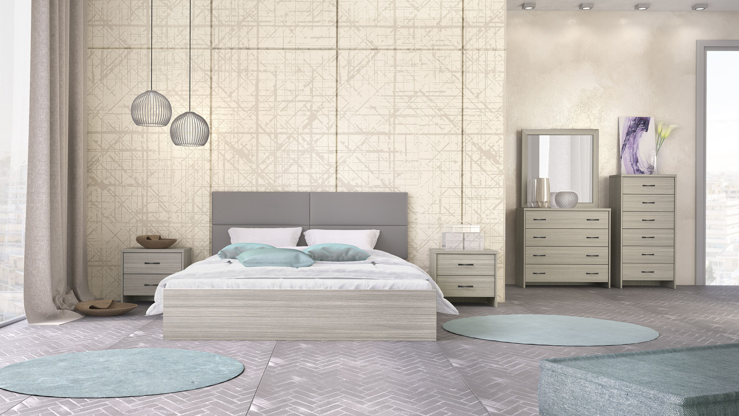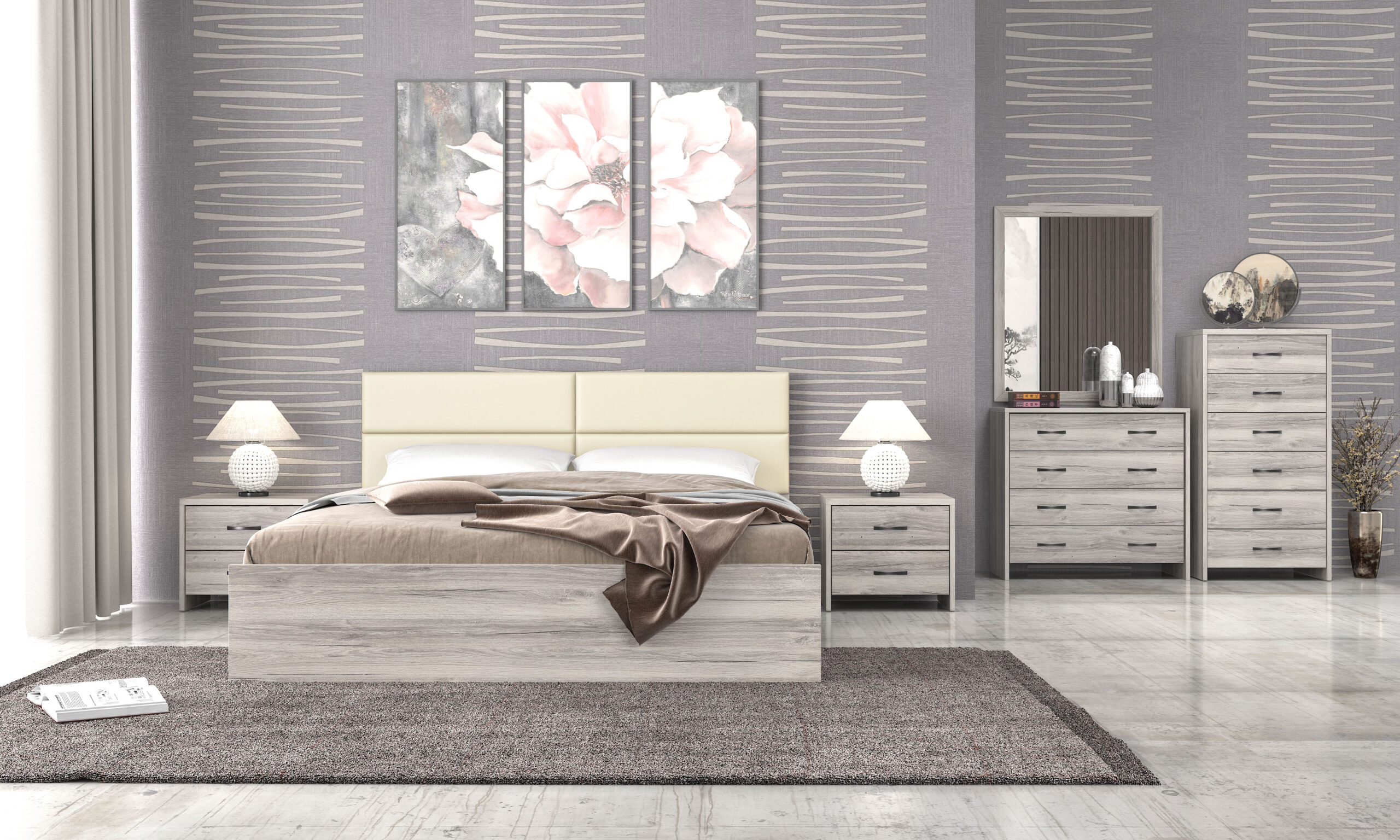Σετ κρεβατοκάμαρα αποτελούμενη απο κρεβάτι με δερμάτινο κεφαλάρι, 2 κομοδίνα με 2 συρτάρια,τουαλέτα και καθρέφτη.