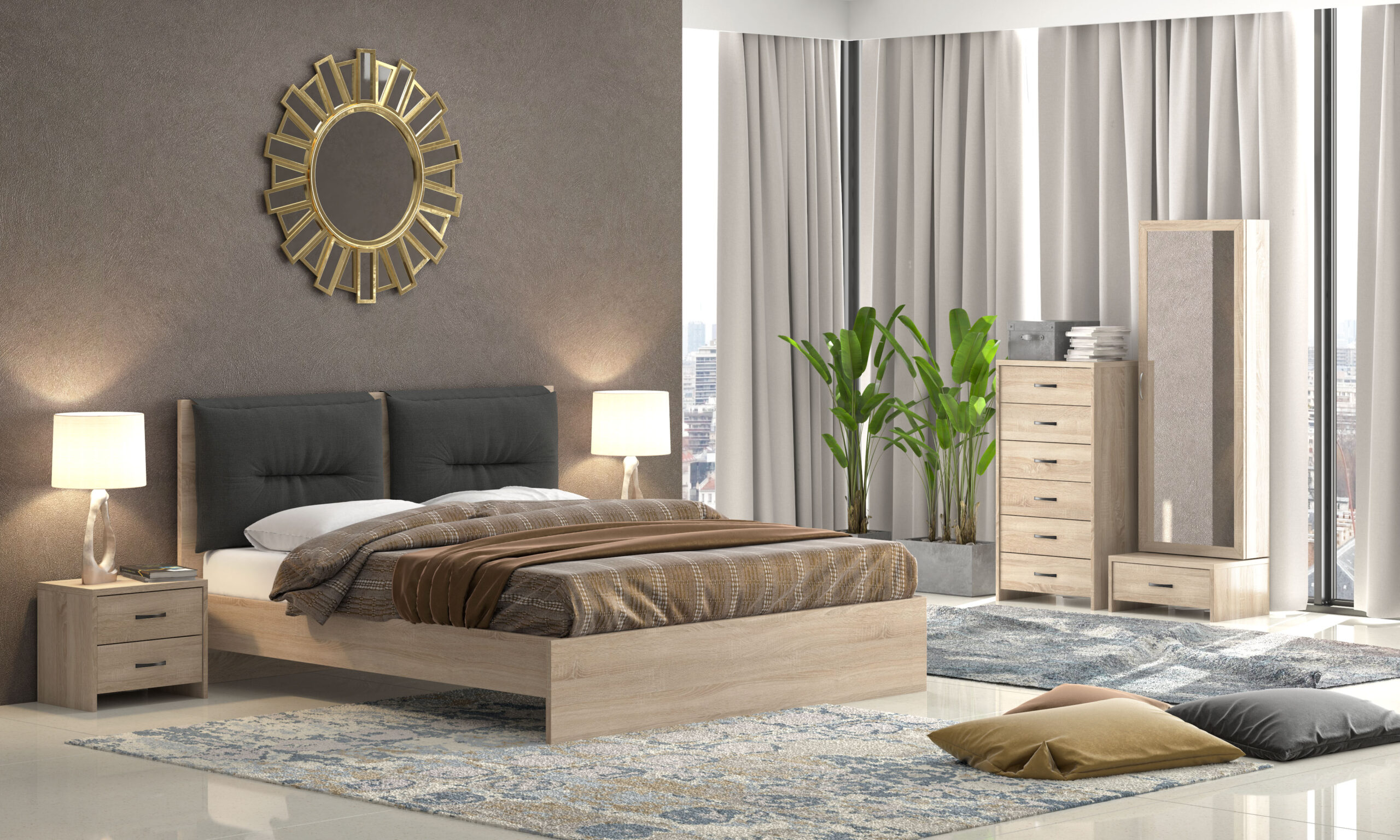 Σετ κρεβατοκάμαρα αποτελούμενη απο κρεβάτι με μαξιλάρα στο κεφαλάρι, 2 κομοδίνα με 2 συρτάρια,τουαλέτα και καθρέφτη.
